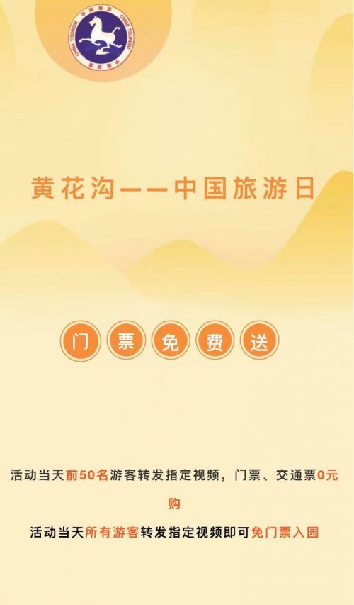 “畅游中国,幸福生活”2024年中国旅游日,黄花沟重磅活动来袭! 活动当天前50名游客转发指定视频,门票、交通票0元购 活动当天所有游客转发指定视频即可免门票入园