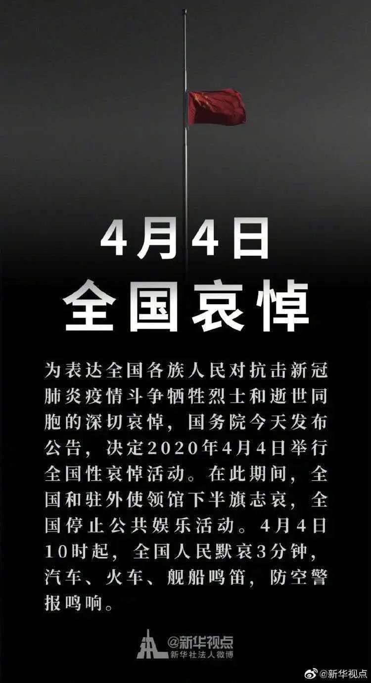 为表达全国各族人民对抗击新冠肺炎疫情斗争牺牲烈士和逝世同胞的深切哀悼,国务院发布公告,决定2020年4月4日举行全国性哀悼活动。在此期间,全国和驻外使领馆下半旗志哀,全国停止公共娱乐活动。4月4日10时起,全国人民默哀3分钟,汽车、火车、舰船鸣笛,防空警报鸣响。